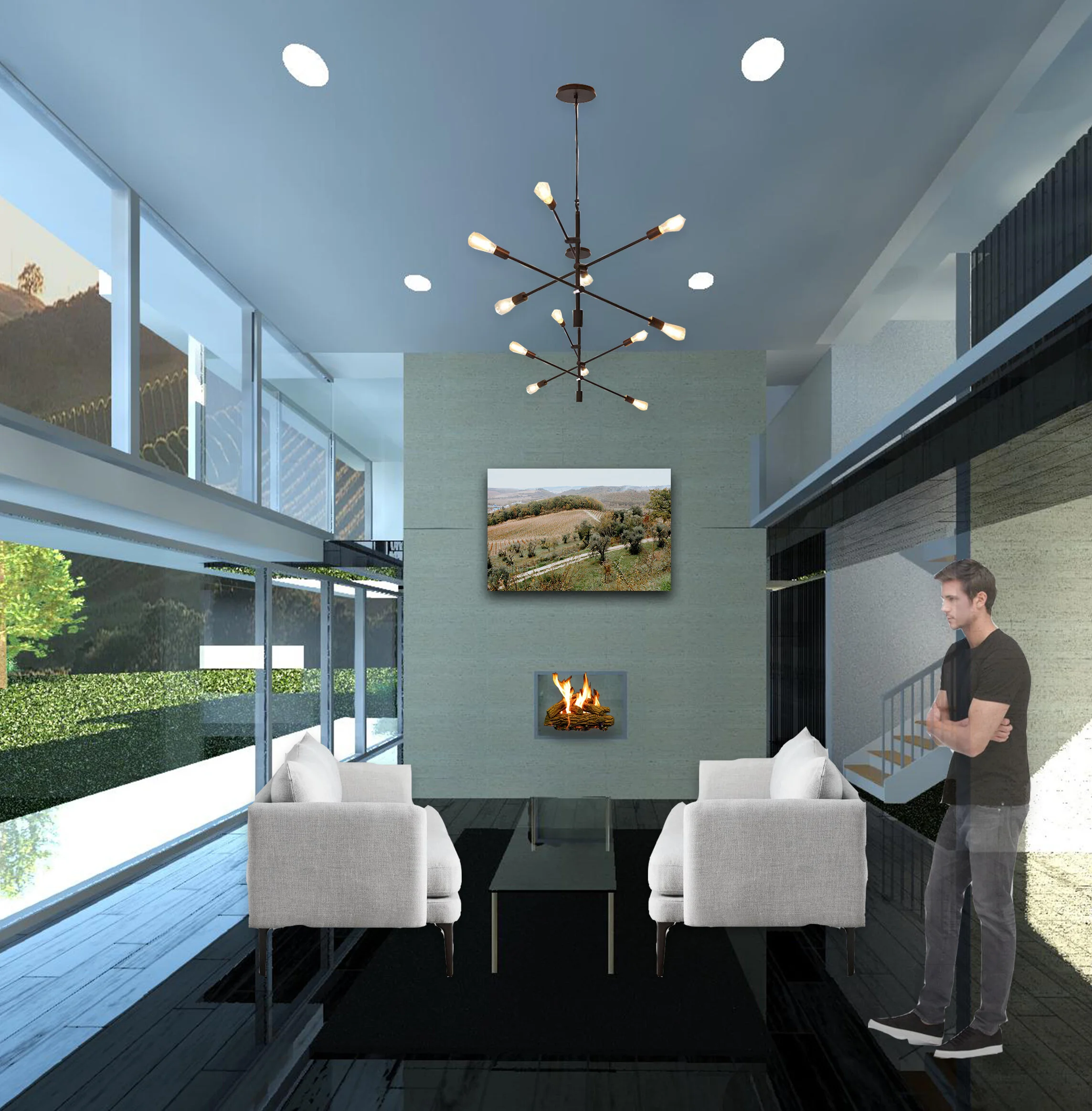 As you enter through the front door of the home you walk into the living room. There is a large curtain wall that covers the whole back of the house which allows you to look out over the vineyards.