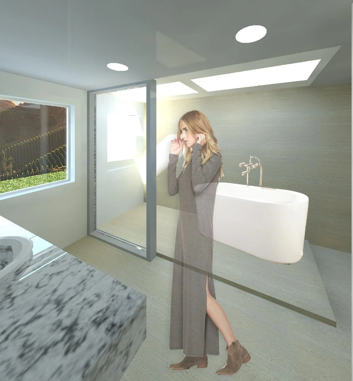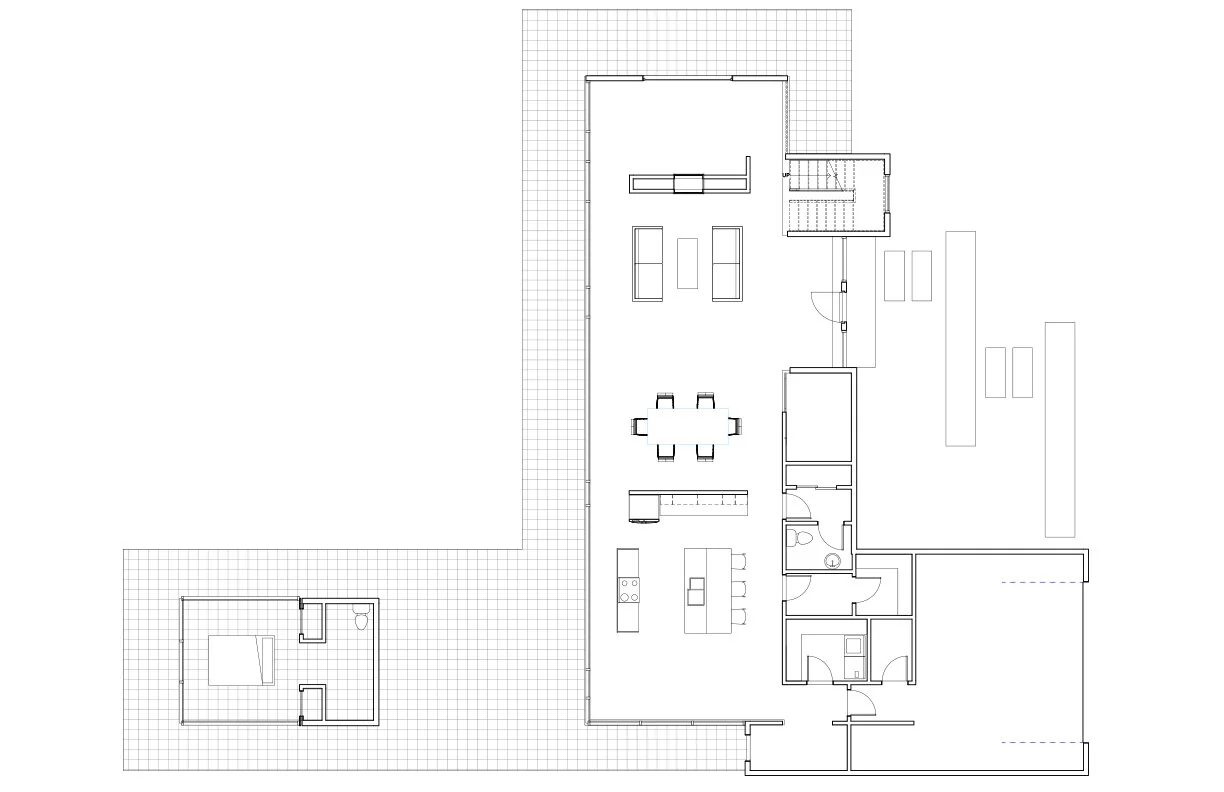 In the back of the home there is a separate guest suite that is semi-attached to the home. It has a curtain wall that wraps around the bedroom with a private bathroom in the back.